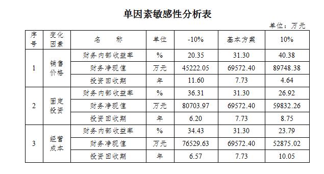 5、稅前財務(wù)內(nèi)部收益率為31.3%,大于行業(yè)基準(zhǔn)收益率12%,計算期財務(wù)凈現(xiàn)值為69572.4萬元,從財務(wù)評價角度項目可行。
