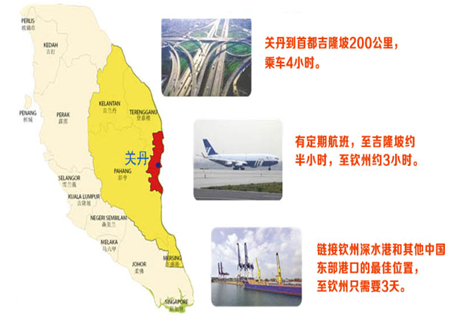 馬中關(guān)丹產(chǎn)業(yè)園(MCKIP),位于彭亨州關(guān)丹市格賓(GEBENG)工業(yè)區(qū)內(nèi),面積1500英畝(約6.07平方公里),距離關(guān)丹港僅5公里,關(guān)丹市區(qū)25公里,關(guān)丹機(jī)場(chǎng)40公里,距離吉隆坡250公里,地理位置優(yōu)越,交通便利。關(guān)丹港距離欽州港1104海里,航行僅需3-4天,到中國(guó)其他港口也只需4-8天時(shí)間。