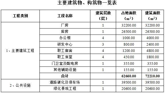 本次建設項目總用地面積350畝,總建筑面積為72210.00平方米,主要建筑內(nèi)容及規(guī)模如下表: