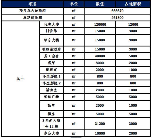 養(yǎng)老院區(qū)域占地面積632670㎡,建筑面積45800㎡,建筑內(nèi)容: