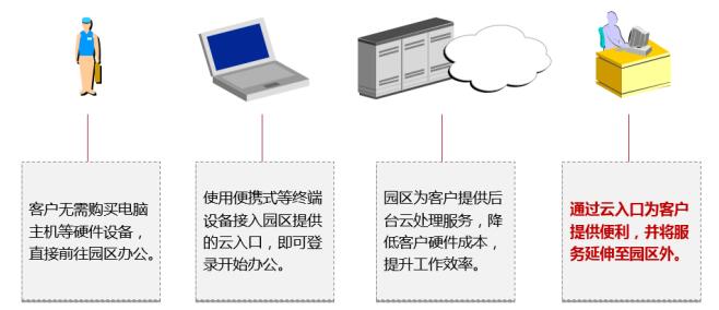 企業(yè)客戶可以通過云端入口,直接憑借賬號登陸并進行日常辦公,云計算服務(wù)將突破園區(qū)內(nèi)外界限,提升企業(yè)靈活度,將服務(wù)延伸至園區(qū)外。