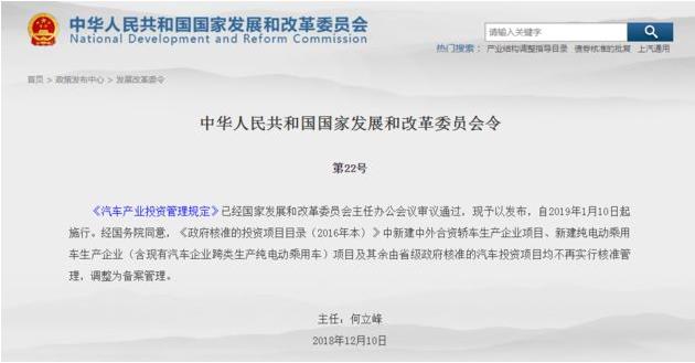 國家發(fā)展改革委于2018年12月10日發(fā)布第22號令,頒布《汽車產(chǎn)業(yè)投資管理規(guī)定》,自2019年1月10日起施行。今年是改革開放40周年。發(fā)布實(shí)施《規(guī)定》,是貫徹落實(shí)黨中央、國務(wù)院關(guān)于深化“放管服”改革、全面放開一般制造業(yè)決策部署的重大舉措,是主動...