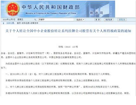 財稅〔2018〕137號 各省、自治區(qū)、直轄市、計劃單列市財政廳(局),國家稅務總局各省、自治區(qū)、直轄市、計劃單列市稅務局,新疆生產(chǎn)建設兵團財政局,全國中小企業(yè)股份轉讓系統(tǒng)有限責任公司,中國證券登記結...