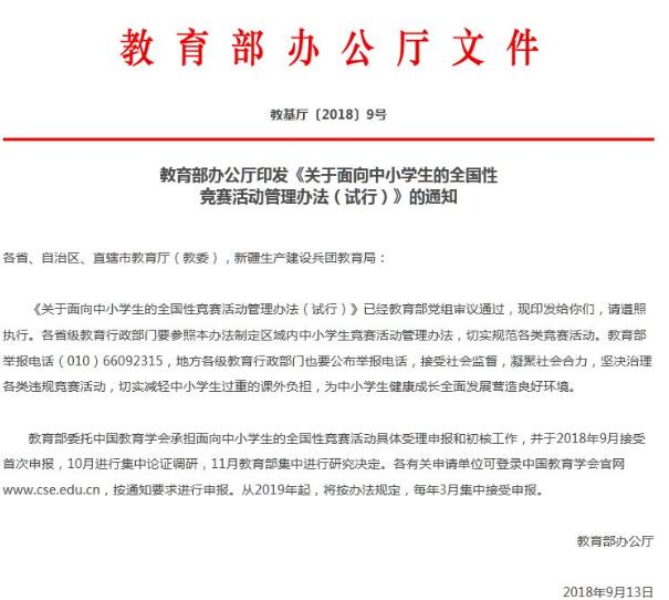 近日,教育部辦公廳印發(fā)文件表示,不得組織中小學(xué)生參加清單之外的冠以“全國”“國家”等字樣面向中小學(xué)生的競賽。在競賽產(chǎn)生的證書顯著位置,要標(biāo)注教育部批準(zhǔn)文號(hào)及“不作為中小學(xué)招生入學(xué)依據(jù)”等字樣。...