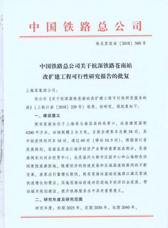 杭深鐵路蒼南站改擴(kuò)建工程可行性研究報(bào)告獲中國(guó)鐵路總公司批復(fù)