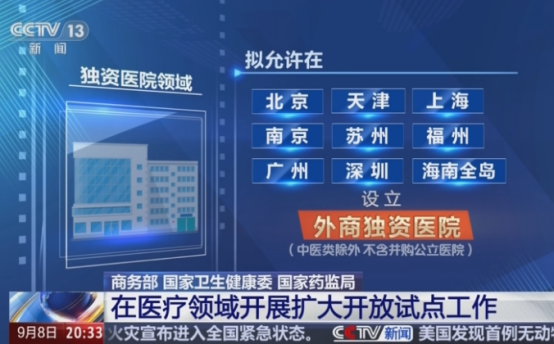 黨的二十屆三中全會(huì)明確提出,擴(kuò)大自主開放,推動(dòng)電信、互聯(lián)網(wǎng)、教育、文化、醫(yī)療等領(lǐng)域有序擴(kuò)大開放。9月7日,商務(wù)部、國(guó)家衛(wèi)生健康委、國(guó)家藥監(jiān)局印發(fā)《關(guān)于在醫(yī)療領(lǐng)域開展擴(kuò)大開放試點(diǎn)工作的通知》,提出擬允許在北京、天津、上海、南京、蘇州、...
