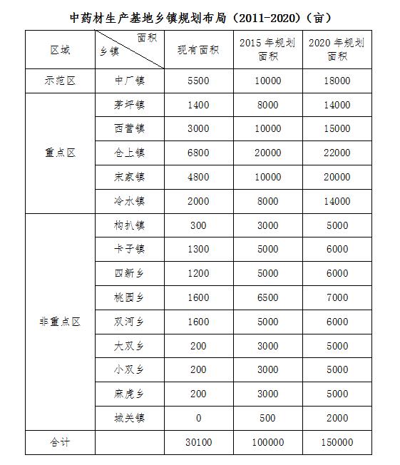 規(guī)劃全縣中藥材產(chǎn)業(yè)的發(fā)展將采用“示范帶動(dòng)、板塊推進(jìn)、全面發(fā)展”的模式,建立1個(gè)標(biāo)準(zhǔn)化示范區(qū),建設(shè)5個(gè)重點(diǎn)區(qū)域,9個(gè)非重點(diǎn)區(qū)域。