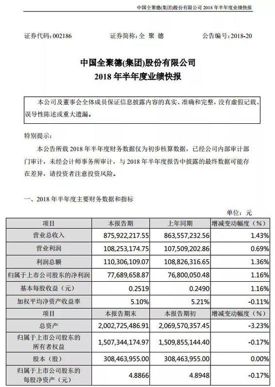 7月19日晚間,全聚德發(fā)布了2018年半年度業(yè)績(jī)快報(bào),實(shí)現(xiàn)營(yíng)業(yè)總收入接近8.76億元,同比增長(zhǎng)僅為1.43%左右;歸屬于上市公司股東的凈利潤(rùn)約為0.78億元,同比增長(zhǎng)為1.16%。...