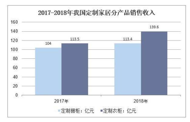 2018年我國(guó)定制櫥柜市場(chǎng)銷(xiāo)售收入為113.4億元,同比增長(zhǎng)9%;定制衣柜市場(chǎng)銷(xiāo)售收入為139.6億元,同比增長(zhǎng)23%。