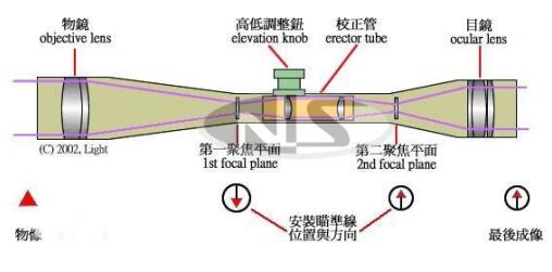 一個光學瞄準鏡至少有三個光學透鏡組,一個是物鏡組(ObjectiveLens),一個是校正鏡管組(ErectorTube),和目鏡組(OnicularLens),還可能有其他鏡組。物鏡組負責集光,所以當物鏡越大,瞄準鏡中的景物就應該更明亮,目鏡組負責將這些光線改換回平行光線,讓眼睛可以聚焦,造就最大的視野;而校正鏡管組則是將物鏡的影像由上下顛倒、左右相反而修正成正確方向,并且負責調(diào)整倍率。瞄準線所在位置可以在校正鏡組前的第一聚焦平面,或是其后的第二聚焦平面,而風偏調(diào)整鈕、高低調(diào)整鈕、以及放大倍率環(huán)都是用來控制校正鏡管組的左右、高低、前后位置。一個高級瞄準鏡鏡身內(nèi)可能有多達9個以上的鏡片,透過適當?shù)腻兡ぃ渫腹饴士赡艹^95%。不過即使透光率沒這么高,視野內(nèi)的明亮度可能還是高過肉眼視野的明亮度,因為一般物鏡的集光面積都大過眼睛的集光面積。
