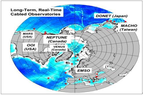 目前世界上已經(jīng)初步建成或在建的較大規(guī)模觀測網(wǎng)主要有:歐洲ESONET/EMSO、美國OOI、加拿大ONC(由VENUS與NEPTUNE組成)、日本DONET、及我國臺灣MACHO等。其中,前三個項目用于海洋探索及多學科研究,DONET及MACHO項目則主要用以地震監(jiān)測和海嘯預(yù)警。