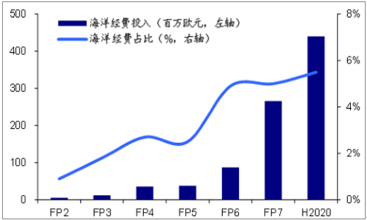 未來,只有占據(jù)信息優(yōu)勢的國家才能掌控海洋。當前,各國為加強海洋信息化建設(shè),均在海洋探索研究領(lǐng)域出臺相關(guān)政策計劃并投入重金,以期在國際競爭中先發(fā)制人。以美國和歐洲(歐盟)為例,據(jù)美國國家科學基金會預(yù)算,未來5年保持每年3.5億美元投入海洋研究。在歐盟研究框架計劃中,海洋探索領(lǐng)域的投入占比不斷增加,在2014和2015年海洋領(lǐng)域投入總額已經(jīng)高達4.4億歐元。