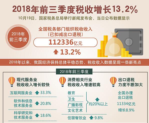 10月22日,國家稅務(wù)總局日前發(fā)布的數(shù)據(jù)顯示,今年前三季度,全國稅務(wù)部門組織稅收收入(已扣減出口退稅)112336億元,增長13.2%,其中,第三季度增長8%,比二季度增速回落5.1個百分點,體現(xiàn)出我國一系列減稅降負措施成效不斷顯現(xiàn)。...