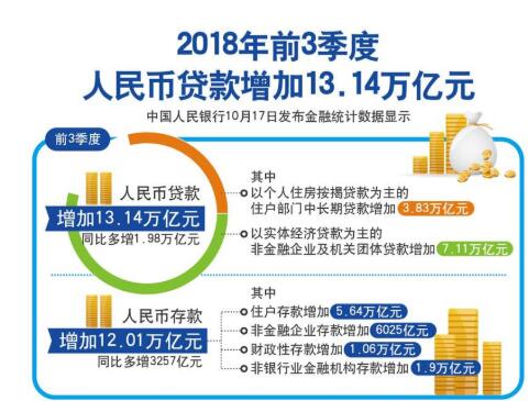 中國(guó)人民銀行17日發(fā)布金融統(tǒng)計(jì)數(shù)據(jù)顯示,前3季度人民幣貸款增加13.14萬(wàn)億元,同比多增1.98萬(wàn)億元。其中,9月份人民幣貸款增加1.38萬(wàn)億元。央行數(shù)據(jù)顯示,前3季度人民幣貸款增加13.14萬(wàn)億元。其中,以個(gè)人住房按揭貸款為主的住戶部門中長(zhǎng)期貸款增加3...
