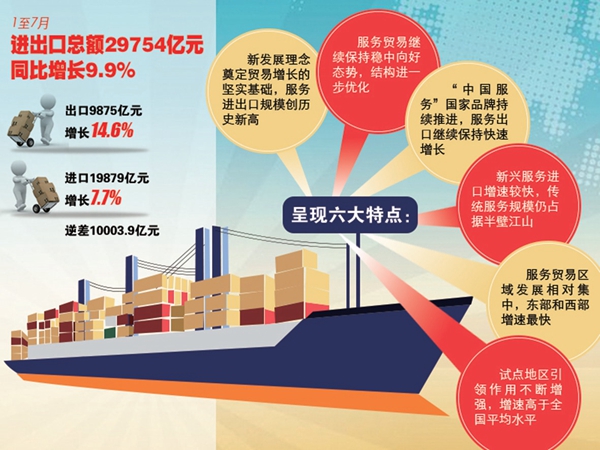 1—7月,我國服務進出口保持較快增長。進出口總額29754億元(人民幣,下同),同比增長9.9%。其中,出口9875億元,增長14.6%;進口19879億元,增長7.7%;逆差10003.9億元。若以美元計,服務進出口、出口和進口增速分別為17.2%、22.3%和14.9%。...