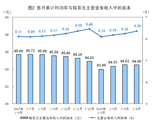 1-5月份,規(guī)模以上工業(yè)企業(yè)實現(xiàn)主營業(yè)務(wù)收入42.9萬億元,同比增長10.2%;發(fā)生主營業(yè)務(wù)成本36.3萬億元,增長9.8%;主營業(yè)務(wù)收入利潤率為6.36%,同比提高0.35個百分點。