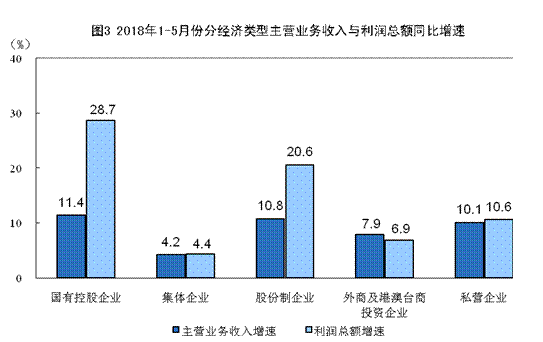 1-5月份,規(guī)模以上工業(yè)企業(yè)中,國有控股企業(yè)實現(xiàn)利潤總額8103.5億元,同比增長28.7%;集體企業(yè)實現(xiàn)利潤總額93.1億元,增長4.4%;股份制企業(yè)實現(xiàn)利潤總額19119.8億元,增長20.6%;外商及港澳臺商投資企業(yè)實現(xiàn)利潤總額6739.1億元,增長6.9%;私營企業(yè)實現(xiàn)利潤總額7466.2億元,增長10.6%。