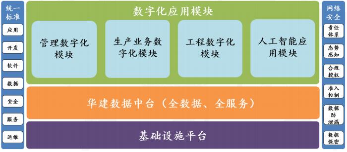 項目建設(shè)內(nèi)容 本項目的建設(shè)內(nèi)容包括基礎(chǔ)設(shè)施底層平臺、智能化數(shù)據(jù)中臺以及管理數(shù)字化、 生產(chǎn)業(yè)務(wù)數(shù)字化、工程數(shù)字化、人工智能應(yīng)用四大應(yīng)用模塊,具體建設(shè)架構(gòu)如下 圖所示:
