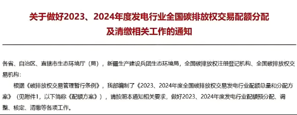 為切實做好全國碳排放權交易市場(以下簡稱強制碳市場)2023、2024年度發(fā)電行業(yè)配額分配相關工作,根據(jù)《碳排放權交易管理暫行條例》,在廣泛征求社會各方意見的基礎上,生態(tài)環(huán)境部印發(fā)實施了《2023、2024年度全國碳排放權交易發(fā)電行業(yè)配額總量和分...