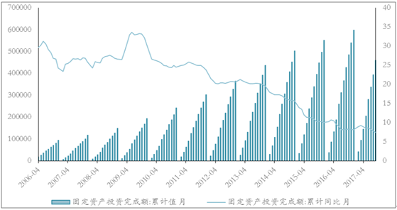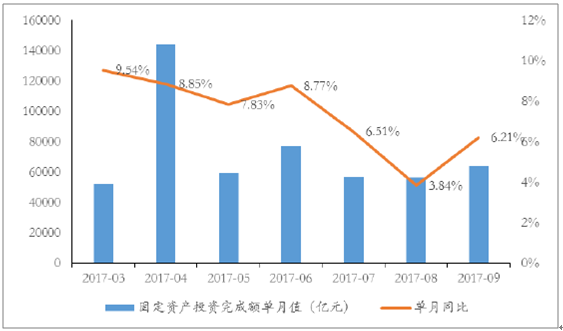 8月以來環(huán)比改善,整體需求不減:從單月數(shù)值來看,2017年9月完成固定資產(chǎn)投資6.4萬億元,同比增長(zhǎng)6.2%,環(huán)比增長(zhǎng)13.37%,較本年度最低水平8月數(shù)據(jù)(同比增長(zhǎng)3.8%、環(huán)比下滑0.1%)呈現(xiàn)溫和改善趨勢(shì),因此我們認(rèn)為有理由推斷,7、8月份固定資產(chǎn)投資的表現(xiàn)一部分或受到天氣等季節(jié)性因素影響。統(tǒng)計(jì)局新聞發(fā)言人也表示,7月份投資有所放緩主要是由于天氣原因:天氣過熱或者洪澇災(zāi)害使得戶外項(xiàng)目施工進(jìn)度受到影響,但不會(huì)改變投資總體平穩(wěn)的趨勢(shì),因此我們預(yù)計(jì)全年固定資產(chǎn)投資需求仍然存在。