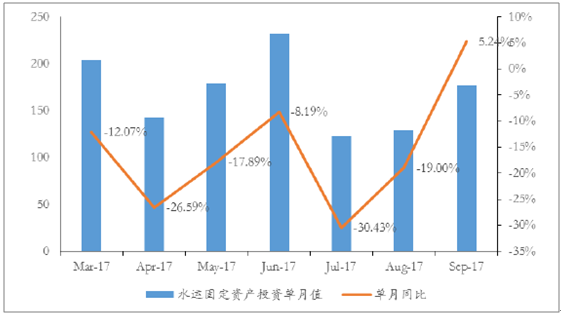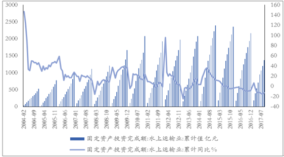 水上運(yùn)輸業(yè)固定資產(chǎn)投資整體呈現(xiàn)波動(dòng)下行趨勢(shì),2017年7月以來單月環(huán)比/同比數(shù)據(jù)改善:從國家統(tǒng)計(jì)局?jǐn)?shù)據(jù)來看,我國水上運(yùn)輸業(yè)固定資產(chǎn)投資累計(jì)值同比增速由2004年2月的高點(diǎn)146.7%,波動(dòng)下滑至2013年2月的低點(diǎn)-24.6%,整體呈現(xiàn)波動(dòng)下行趨勢(shì)。從2017年單月數(shù)據(jù)來看,自7月以來水上運(yùn)輸業(yè)固定資產(chǎn)投資增速有所恢復(fù),已由7月單月同比下滑30.43%回升至9月單月同比增長(zhǎng)5.24%;7月單月環(huán)比下滑47.07%回升至9月單月環(huán)比上升37.19%,整體改善幅度較大。