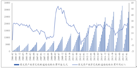 道路運(yùn)輸業(yè)投資增速自2012年2月至今呈波動(dòng)上升趨勢(shì):從國家統(tǒng)計(jì)局歷年公布數(shù)據(jù)來看,我國道路運(yùn)輸業(yè)固定資產(chǎn)投資自2004-2012年間增幅波動(dòng)較大,2006年9月達(dá)到最高值54.7%,2012年2月回落至最低點(diǎn)-8.69%。2012年2月至今,我國道路運(yùn)輸業(yè)固定資產(chǎn)投資增速已由當(dāng)時(shí)低點(diǎn)-8.69%,回升至2017年9月的24.9%,整體呈現(xiàn)波動(dòng)上升趨勢(shì)。同時(shí)2017年9月單月道路運(yùn)輸業(yè)固定資產(chǎn)投資額為4382.26億元,較2016年9月同比增長(zhǎng)29.73%,為2012年12月以來最高點(diǎn);較2017年8月環(huán)比增長(zhǎng)17%,預(yù)計(jì)全年道路運(yùn)輸業(yè)固定資產(chǎn)投資額將保持波動(dòng)上升趨勢(shì)。