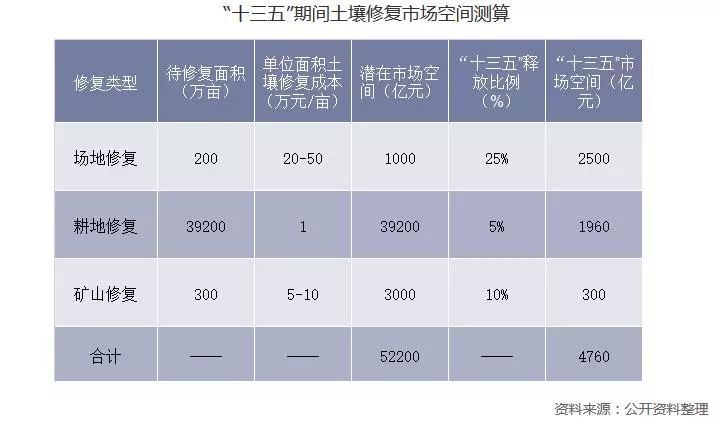 目前土壤修復的主要類型包括場地修復、耕地修復以及礦山修復,預計我國土壤修復潛在的市場空間約為52200億元,“十三五”期間可釋放約4760億元,其中場地修復市場空間將占到一半以上。因為場地修復來自于工業(yè)用地的經(jīng)濟效應,場地的修復能得到資本的認可從而啟動和治理都會相對順利,所以會是未來較長一段時間的主流應用場景。