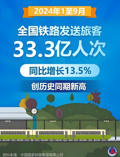 從中國國家鐵路集團(tuán)有限公司獲悉,今年1至9月,全國鐵路發(fā)送旅客33.3億人次,同比增長13.5%,再創(chuàng)歷史同期新高,全國鐵路運(yùn)輸安全平穩(wěn)有序。...